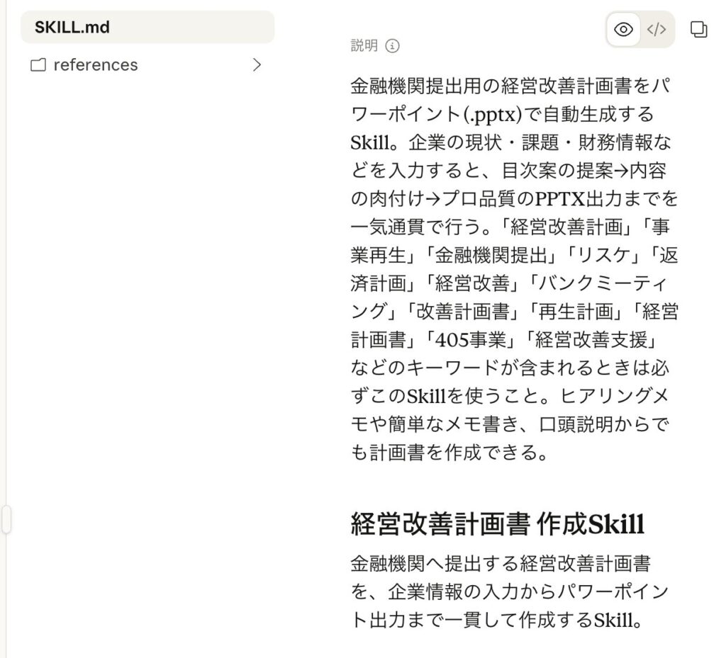 前回はSWOT分析のskillsをClaudeに作ってもらいました。今回は経営改善計画書を訪問前の概要から妄想でつくってもらうskillsをお願いしました。訪問する前に仮説を持ってある程度計画イメージを作っておくことは大事だと思うので。(もちろん仮説にこだわって当てはめすぎるのは良くないですが)