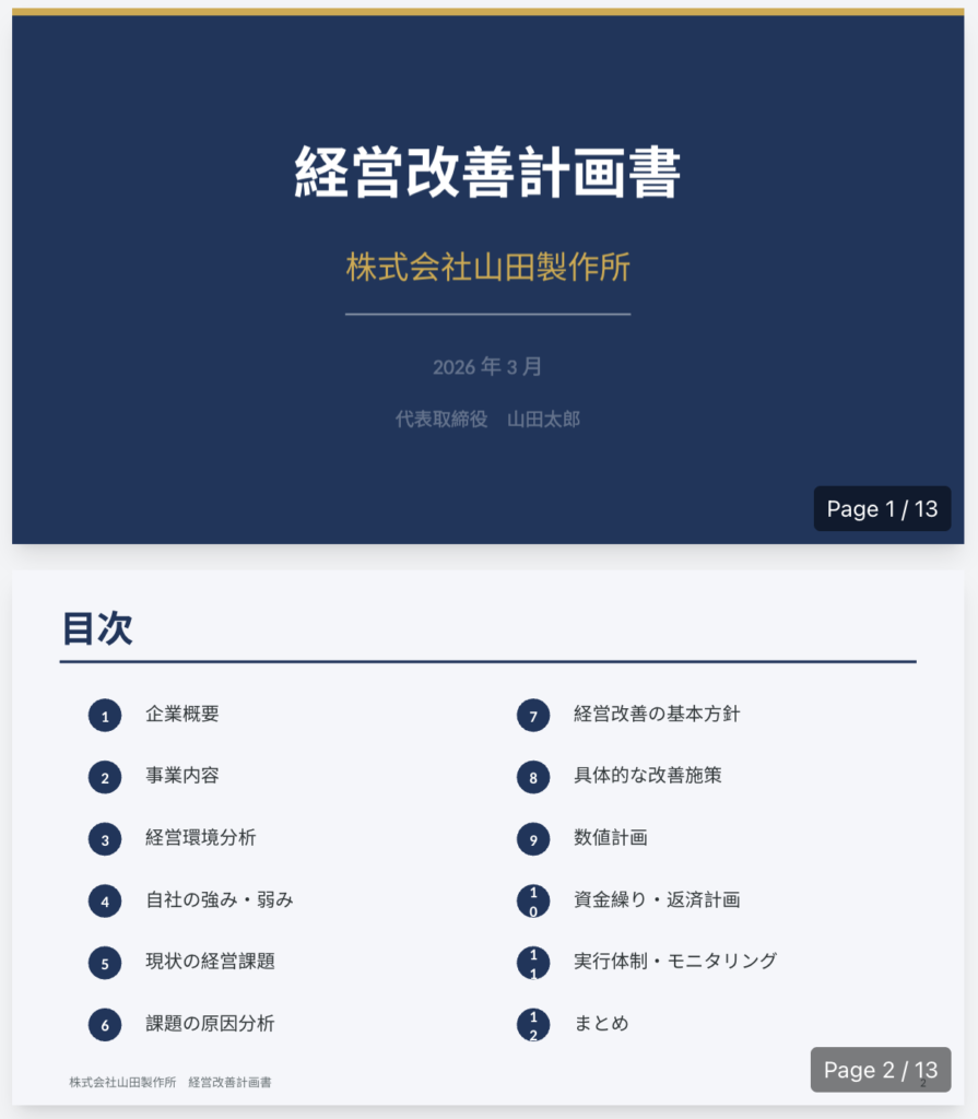 - **表紙**:ダークネイビー背景、中央に企業名と「経営改善計画書」、日付
