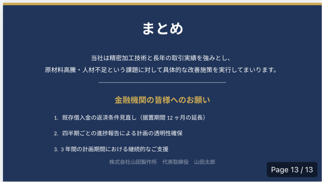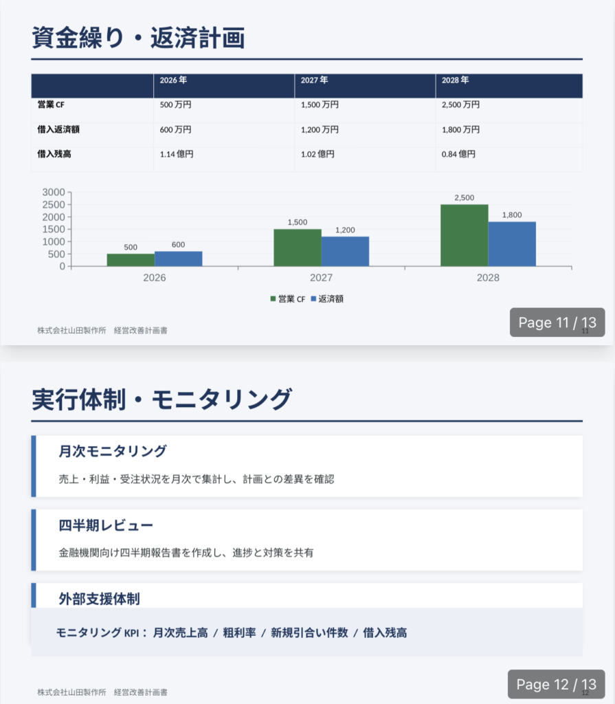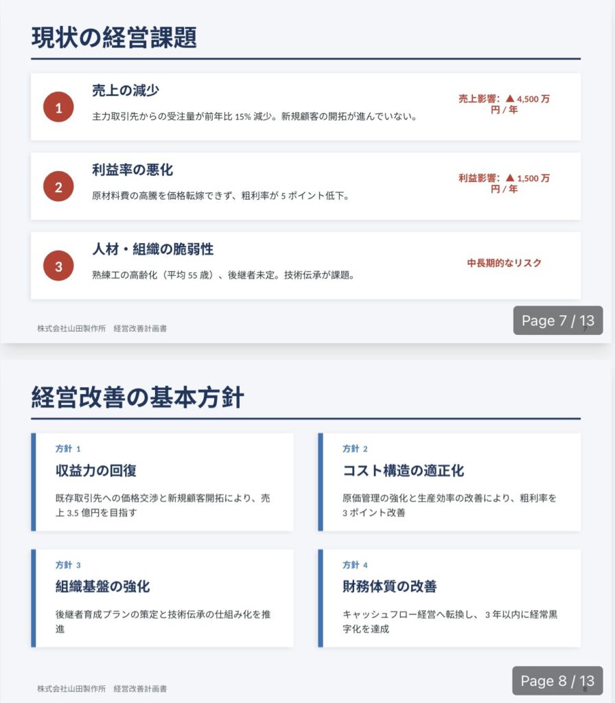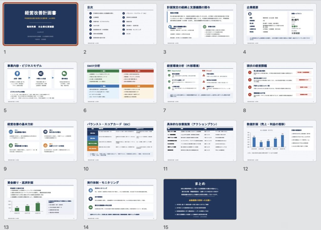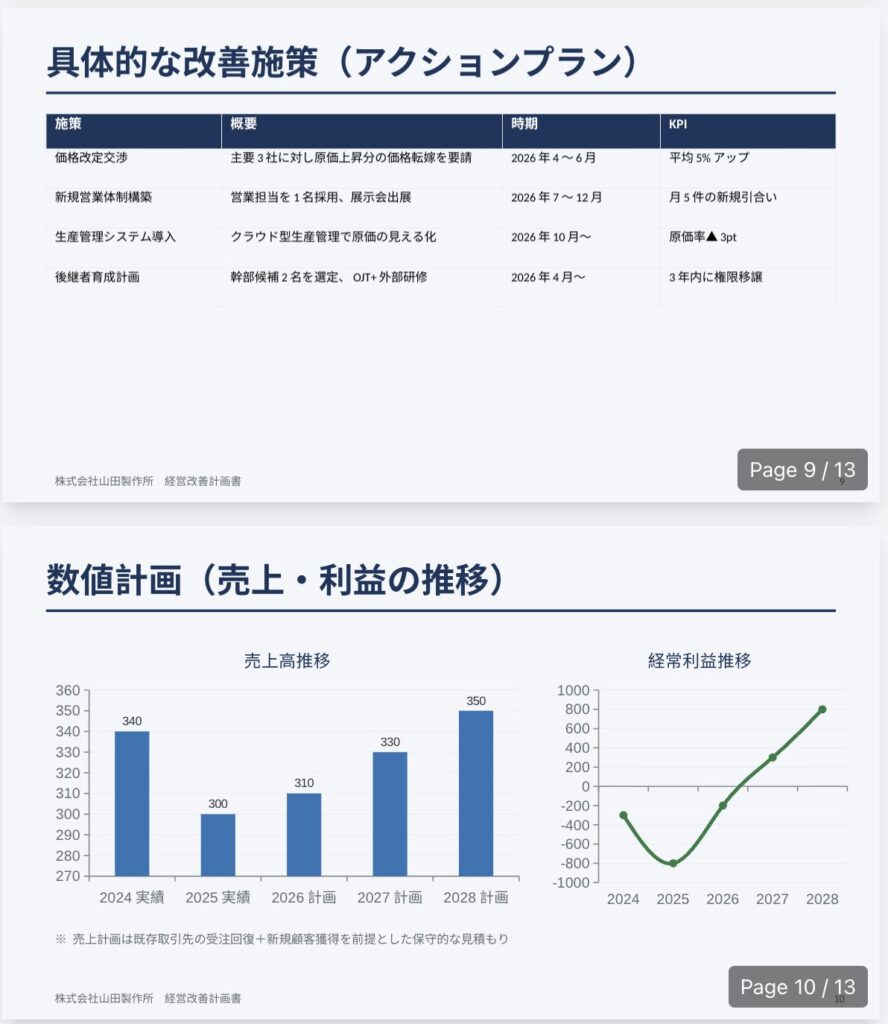 - ファイル名:`経営改善計画書_{企業名}.pptx`