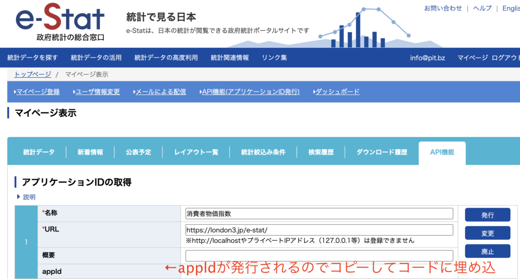 名称とかURLをつけて登録するとappldが発行されました。コピーして後ほどのコードにいれます。
