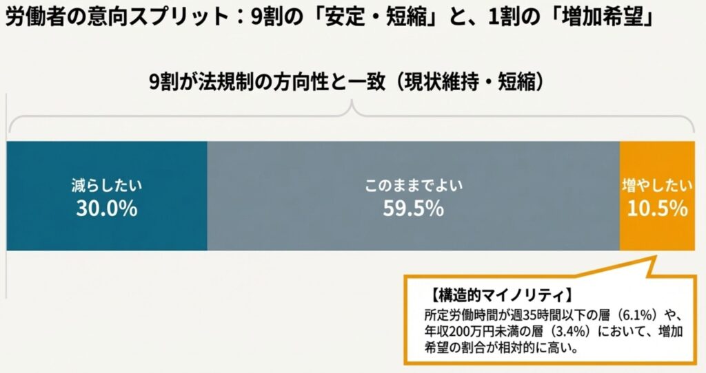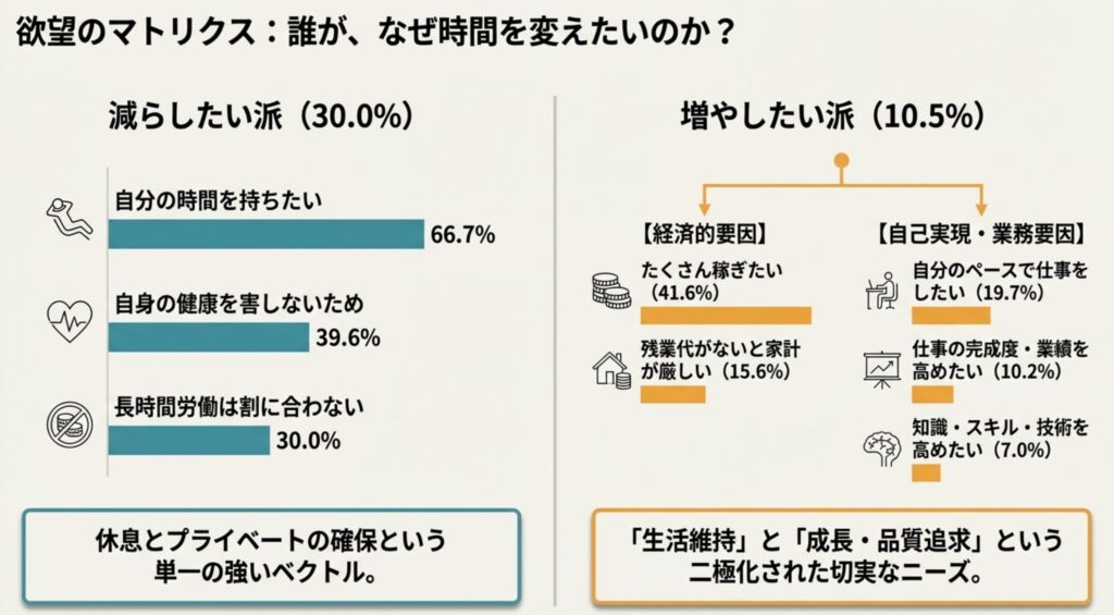 - 増やしたい理由: 「たくさん稼ぎたい(41.6%)」および「残業代がないと家計が厳しい(15.6%)」という経済的動機が主である。