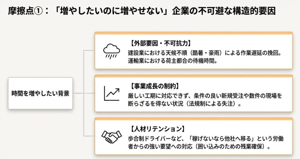 - 労働時間を増やすと、採用難や離職(特に若手・家庭持ち)に直結する。