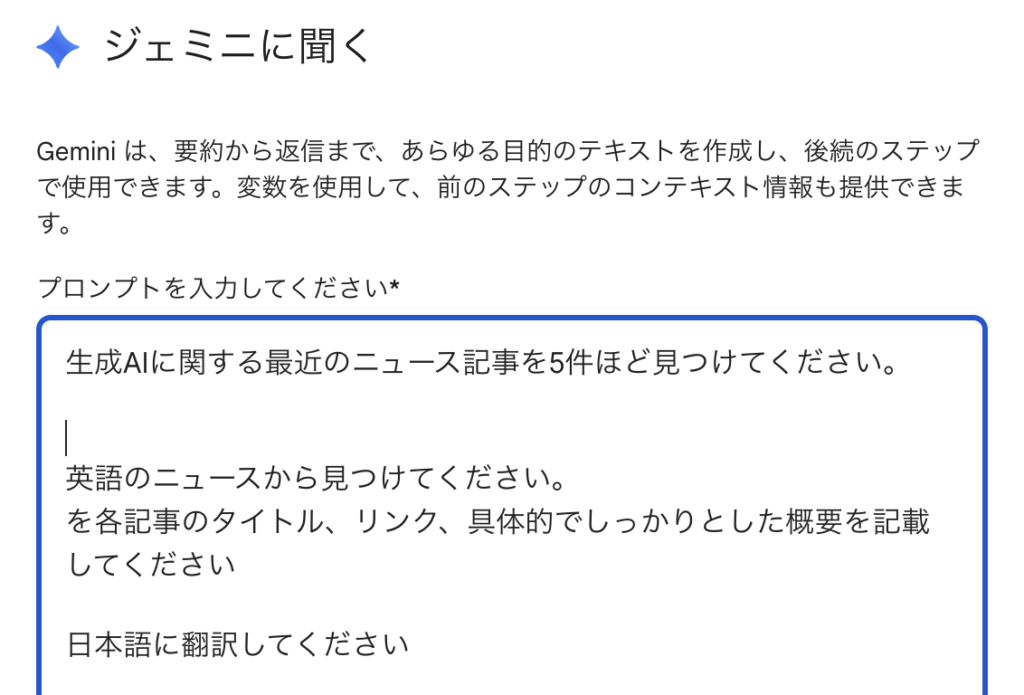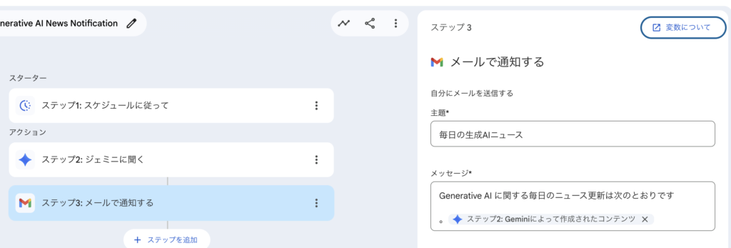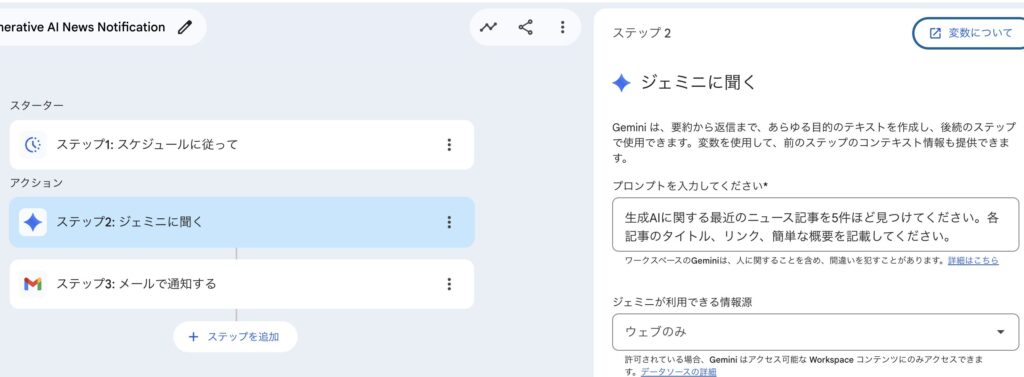 次のステップでGeminiに聞く内容が設定されていました。