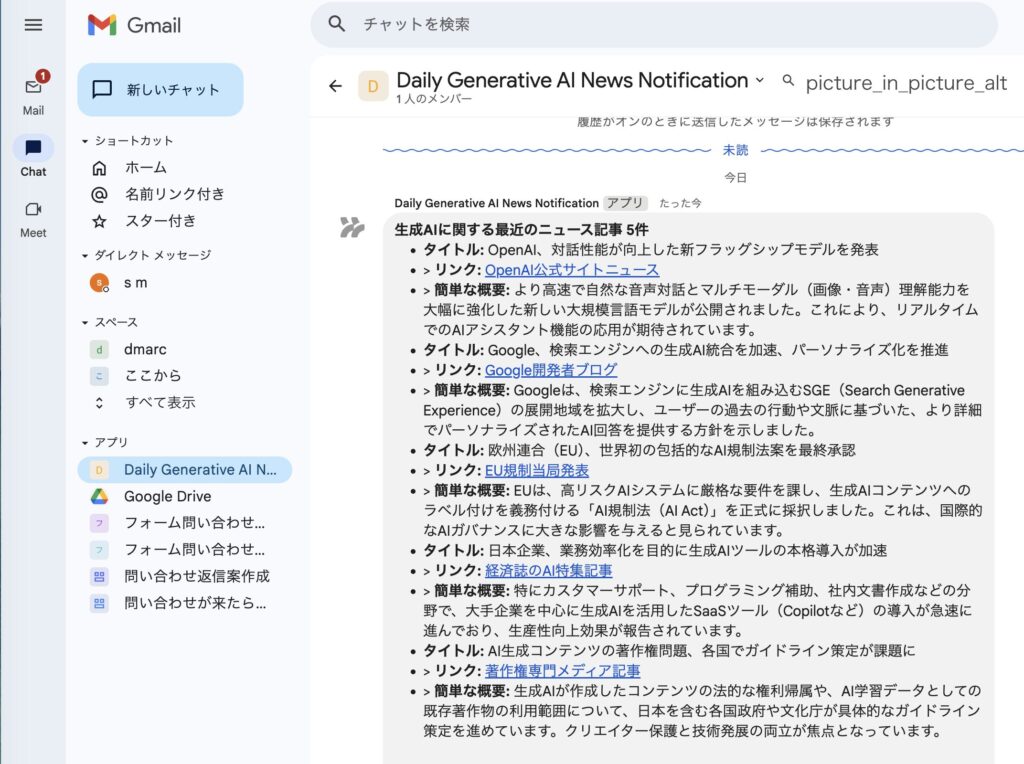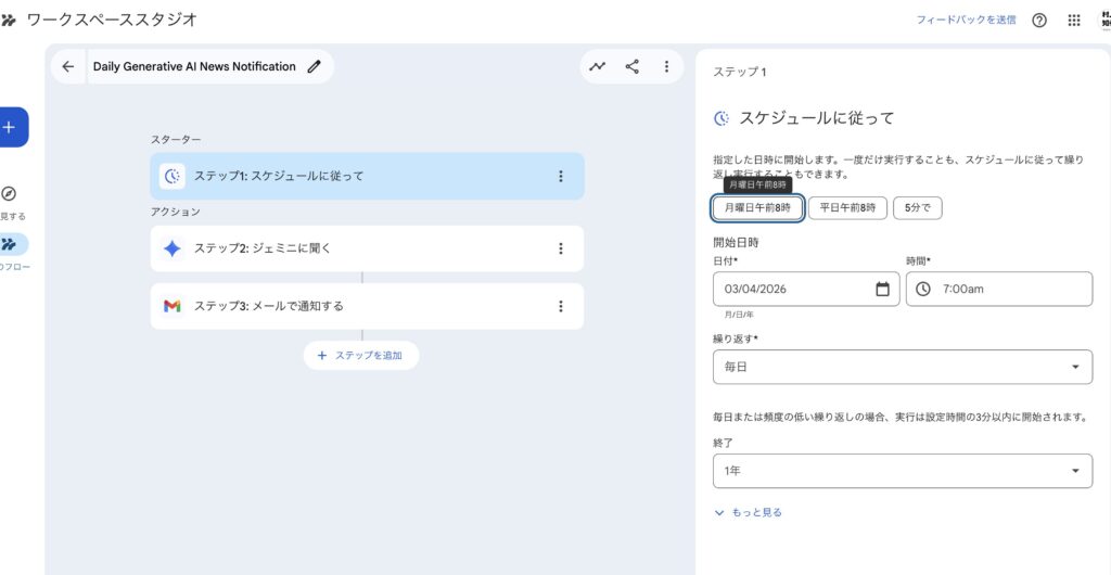 キーワードに関するニュースを毎朝要約してチャットに通知して~GoogleWorkflowStudioでの通知