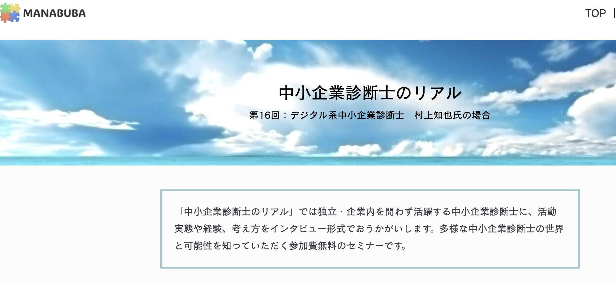 「中小企業診断士のリアル」では独立・企業内を問わず活躍する中小企業診断士に、活動実態や経験、考え方をインタビュー形式でおうかがいします。多様な中小企業診断士の世界と可能性を知っていただく参加費無料のセミナーです。