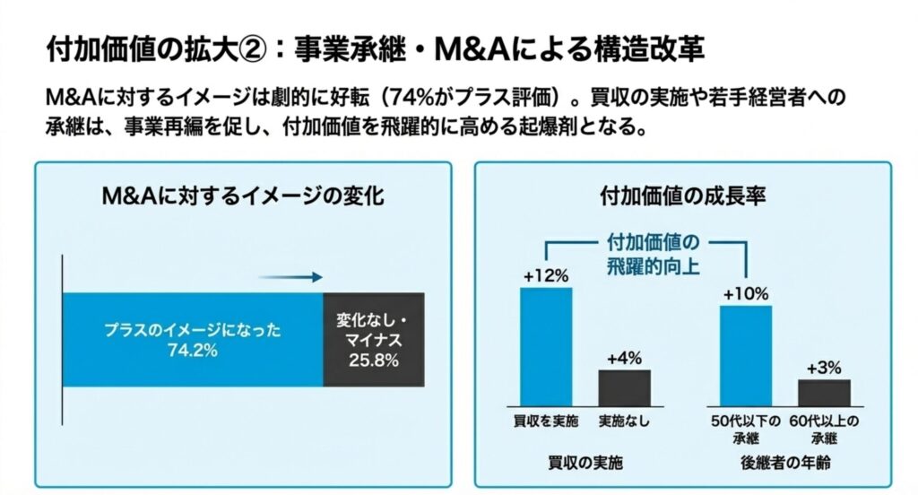 M&Aに対するイメージは劇的に好転しており、74.2%の企業がプラスに捉えています 。実際に買収を実施した企業は、実施していない企業に比べ付加価値の成長率が飛躍的に高まっています(+12%) 。また、50代以下の若手経営者への承継も付加価値向上の起爆剤となります 。外部リソースの活用や世代交代が、事業再編と成長を促す有効な手段となっています 。