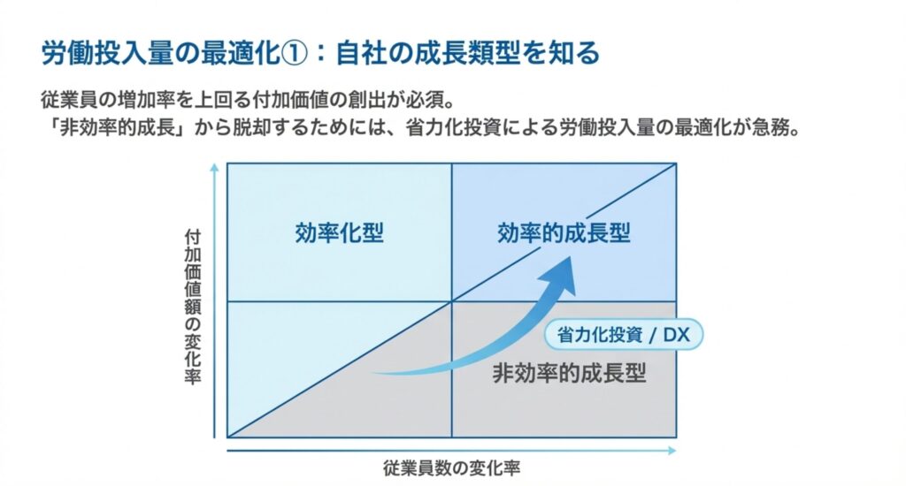 「非効率的成長(従業員増に対し付加価値が伸びない)」から脱却し、「効率的成長」を目指すための視点が示されています 。従業員の増加率を上回る付加価値の創出が必須であり、そのためには省力化投資による労働投入量の最適化が急務です 。自社がどの成長類型に属しているかを把握し、DXなどの投資を通じて、より少ない人数で高い価値を生む構造への転換が求められています 。