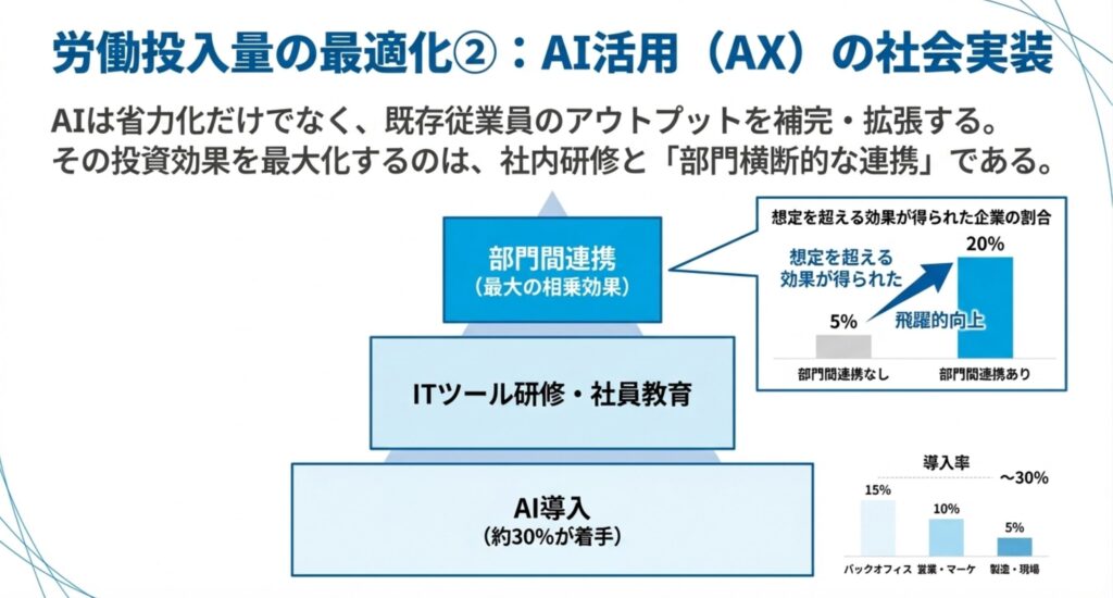 AI(AX)は単なる省力化ツールではなく、従業員のアウトプットを補完・拡張する存在です 。AI導入は約30%の企業が着手していますが、その投資効果を最大化するのは「部門横断的な連携」と「社内研修」です 。部門間連携がある企業は、ない企業に比べて想定を超える効果を得る割合が4倍(20%)に達しており 、組織全体での協力体制がAI活用の成功を左右します 。