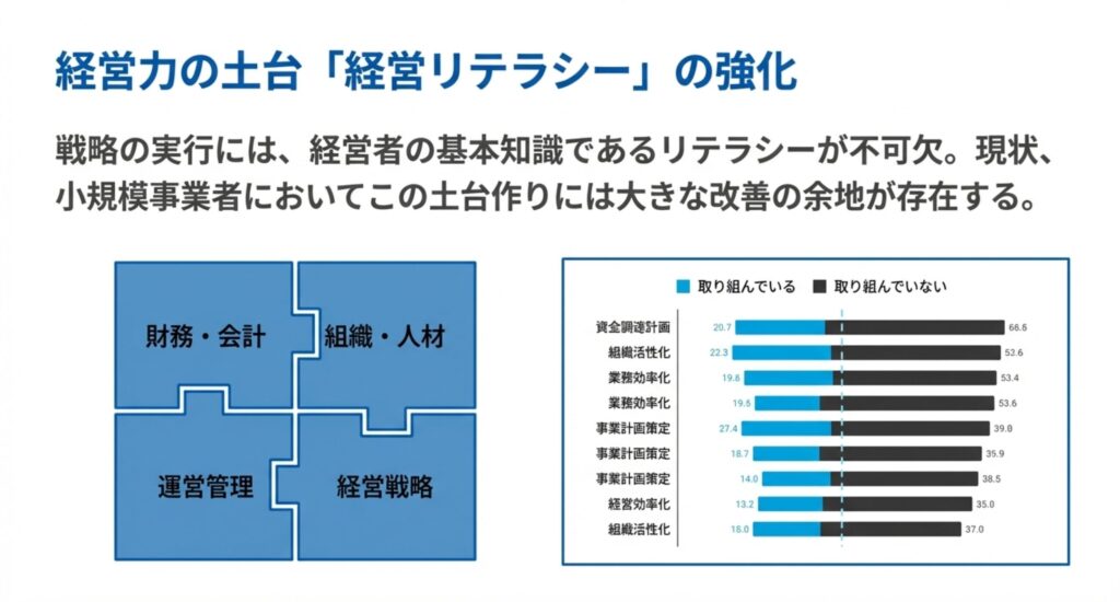 戦略を実行するには、財務・会計、組織・人材などの「経営リテラシー」が不可欠です 。しかし、現状では多くの小規模事業者が事業計画の策定や資金調達計画などの土台作りに取り組めておらず、大きな改善の余地があります 。財務状況の把握や組織活性化といった基本的な知識を習得し、実践することが、持続的な成長に向けた第一歩となります。