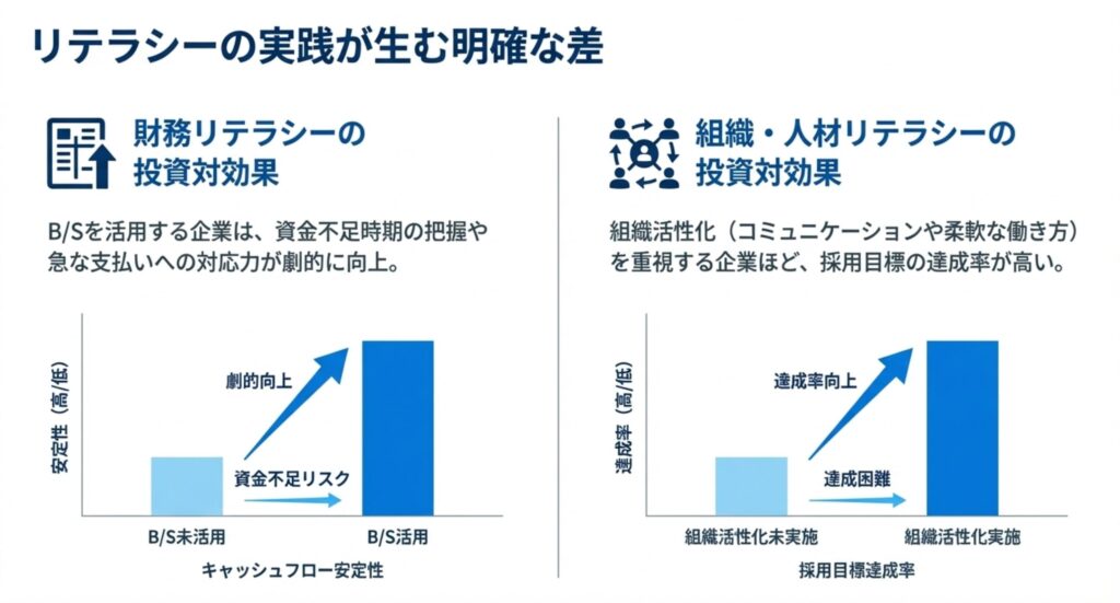 財務や組織に関するリテラシーの実践は、具体的な成果に直結します 。B/S(貸借対照表)を活用する企業は資金不足リスクを早期に把握でき、キャッシュフローの安定性が劇的に向上します 。また、コミュニケーションや柔軟な働き方を重視し組織活性化に取り組む企業ほど、採用目標の達成率が高い傾向にあります 。知識を「知っている」だけでなく「使いこなす」ことが競争力に繋がります 。