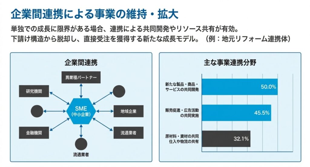 単独での成長に限界がある場合、他社との連携による共同開発やリソース共有が有効です 。下請け構造から脱却し、直接受注を獲得するための新たな成長モデルとして、地元のリフォーム連携体などの事例が挙げられています 。主な連携分野は、製品・サービスの共同開発(60%)や販売促進(45.5%)など多岐にわたり 、ネットワークの活用が中小企業の新たな可能性を切り拓きます。