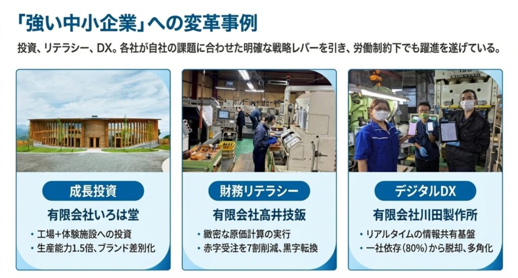理論だけでなく、実際の変革事例が紹介されています 。投資、リテラシー、DXといった明確な戦略レバーを引くことで、労働制約下でも躍進を遂げている企業が存在します 。工場投資で生産能力を1.5倍にした企業や、緻密な原価管理で黒字転換した企業、DXにより特定顧客への依存から脱却した企業など 、各社が自社の課題に合わせて最適なアプローチを選択し、成果を上げていることが示されています。