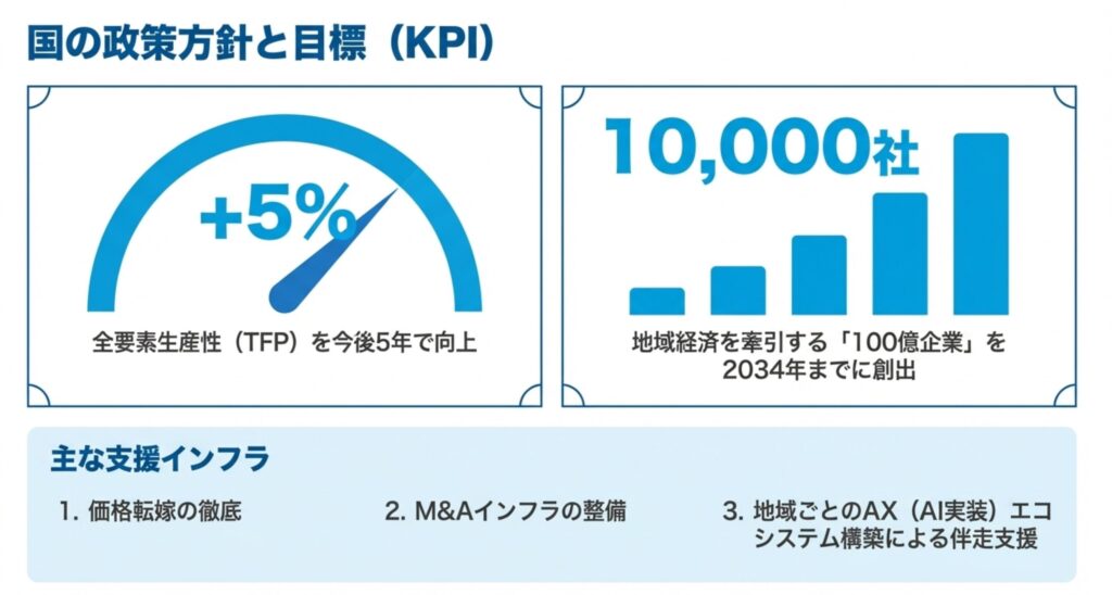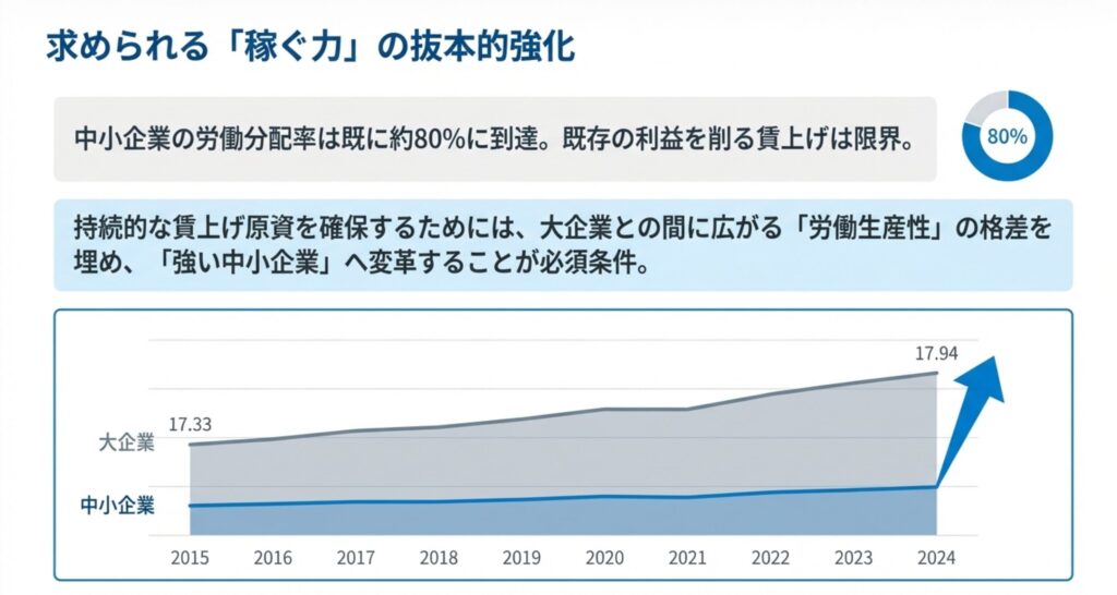 中小企業の労働分配率は既に約80%に達しており、既存の利益を削る形での賃上げは限界に来ています 。持続的な賃上げを実現するためには、大企業との間に存在する「労働生産性」の大きな格差を埋めることが必須条件です 。単なるコスト削減ではなく、付加価値を高めて「稼ぐ力」を抜本的に強化し、強い企業体質へと変革することが求められています 。