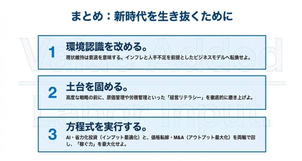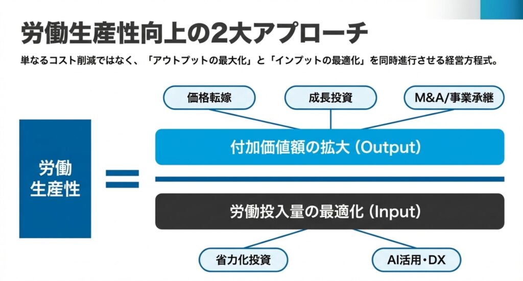労働生産性を高めるための「経営方程式」として、アウトプットの最大化とインプットの最適化を同時進行させる手法が提示されています 。具体的には、価格転嫁や成長投資、M&Aによる「付加価値額の拡大(Output)」と、省力化投資やAI活用による「労働投入量の最適化(Input)」の2方向からのアプローチです 。これらを組み合わせることで、効率的に生産性を向上させます。