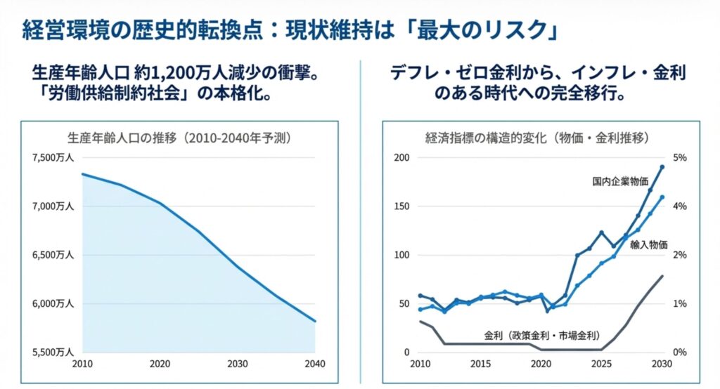2040年までに生産年齢人口が約1,200万人減少するという衝撃的な予測が示されています 。また、長らく続いたデフレ・ゼロ金利時代から、インフレ・金利のある時代への完全な移行という構造変化も起きています 。これらの変化により、従来通りの経営では存続が危うい「労働供給制約社会」が本格化しており、現状維持からの脱却が急務であることが示唆されています 。