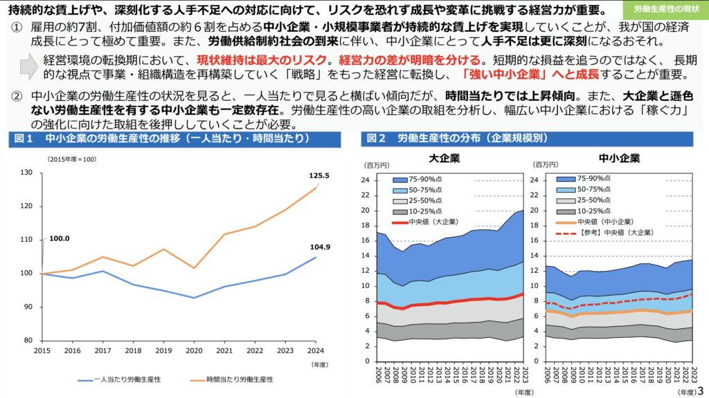• 分配率の逼迫: 中小企業の労働分配率は既に8割に近い水準(大企業は約47%)に達しており、現在の収益構造のままでは賃上げ原資の確保が極めて困難な状況にあります。