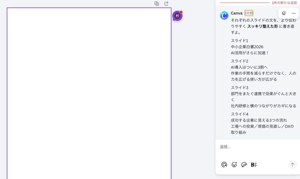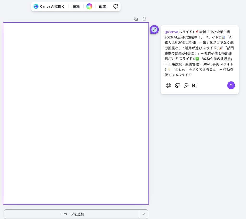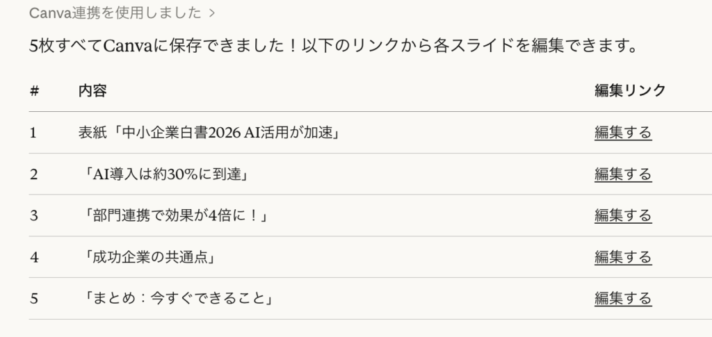 Canvaの画面でCanvaAIに5枚スライド構成をそのまま投げてみました。
