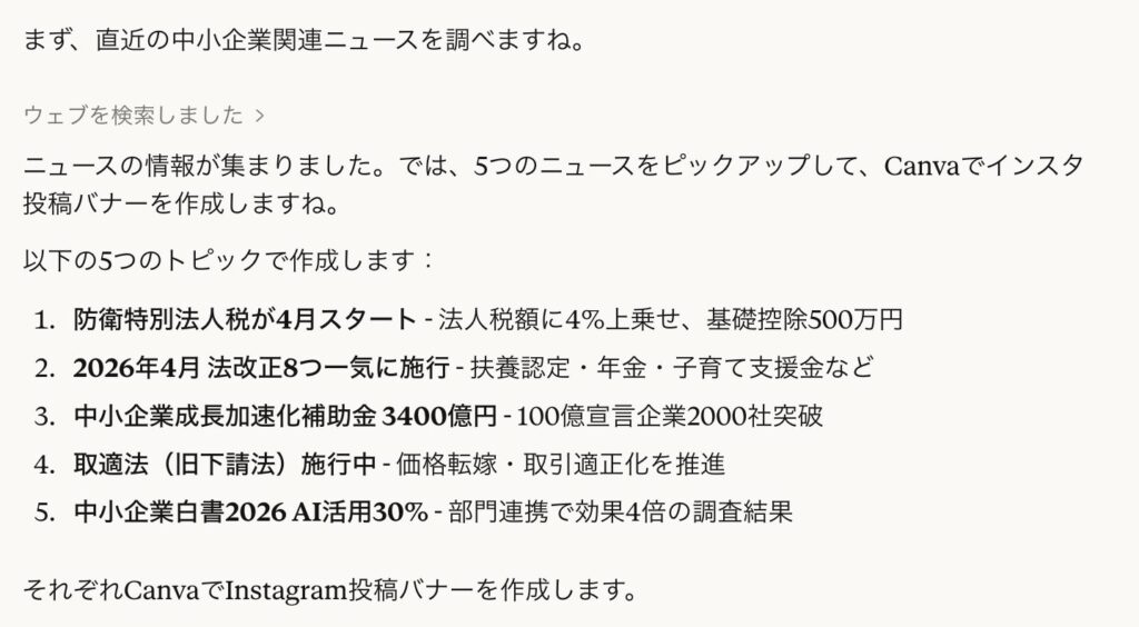 まずは中小企業の直近のニュースを調べてくれました。2026年4月の法改正などタイムリーな内容になっていそうです。