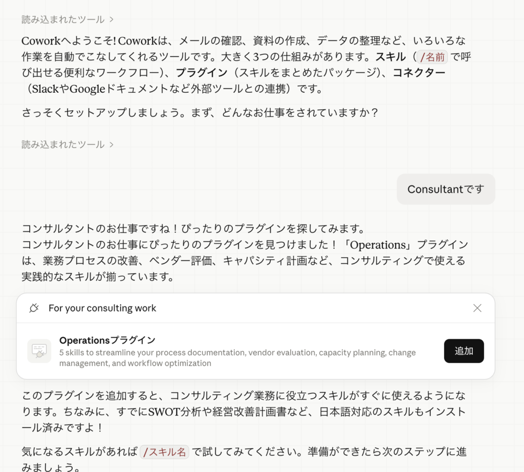 ホーム>デジタル>AI Claude Coworkが自分の仕事に合わせてプラグインを提案してきた2026年4月14日 色々設定を自分でやることもあるけど、AIは向こうから提案してくるのはありがたいですね。 目次1. スキルが入れられた スキルが入れられた コンサルタント向けのスキルを提案してきました 使うかどうかはさておきですが。 そんなところで AIclaudePosted by tomoyamurakami