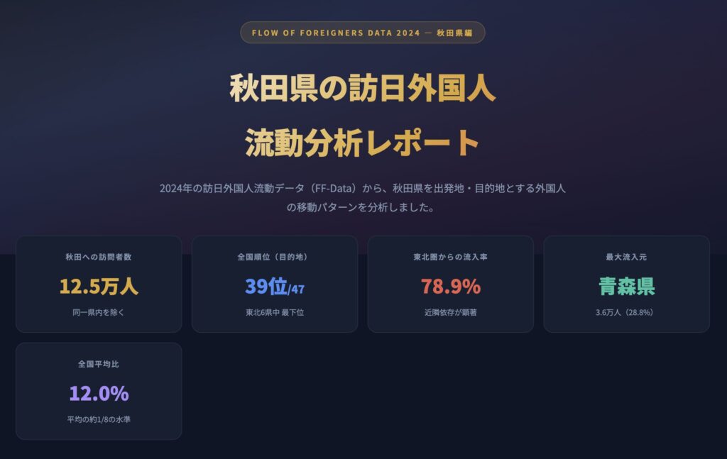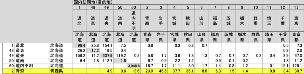 全国でなくて、都道府県に絞ってみると課題が見えてきそうですね。近隣の中からの移動データが中心で、東京や大阪から直接来ている人は少ない。まあ仕方ないでしょうが。何よりも秋田目当て直接は来なくて、東北を回っているついでに来ているように見受けられます。