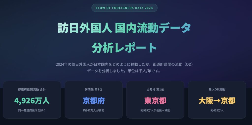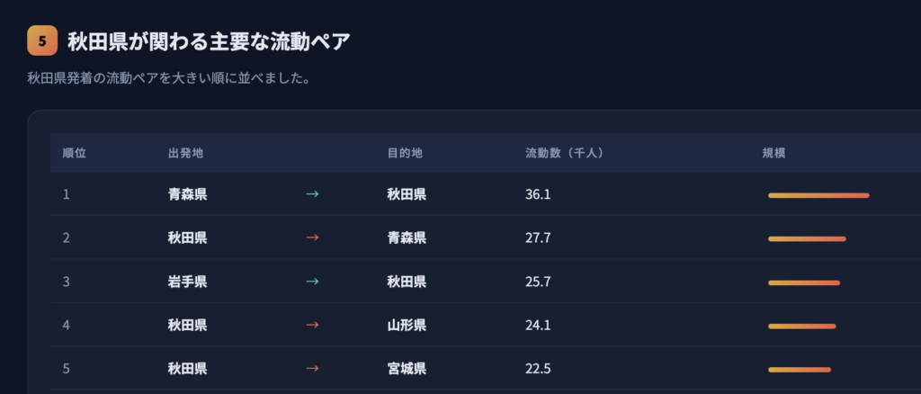 それで、このエクセルをClaudeに渡して分析してレポートを作ってもらったのが以下です。ただフローのデータなので表現が難しかったですね。都道府県間 流動ペア Top 20とか視点は面白かったですが、メジャーな県がならんでしまいましたね。元々のエクセルの形式、相関図っぽい見え方のほうが実はわかりやすかったですね。