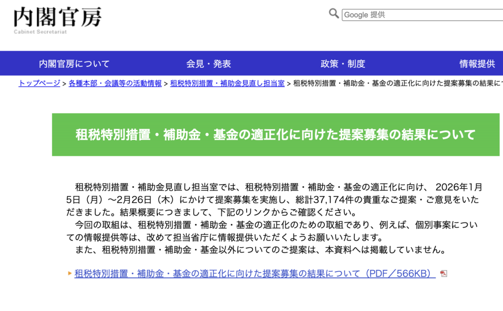 租税特別措置・補助金見直し担当室では、租税特別措置・補助金・基金の適正化に向け、 2026年1月5日(月)~2月26日(木)にかけて提案募集を実施し、総計37,174件の提案からのまとめ資料です。