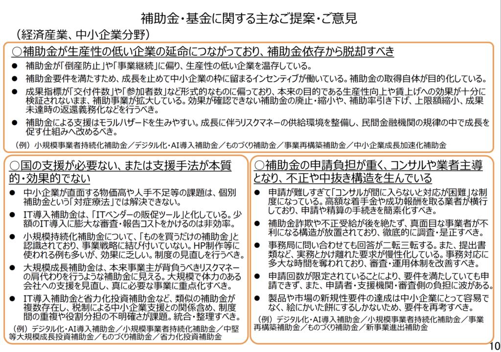 - IT導⼊補助⾦と省⼒化投資補助⾦など、類似の補助⾦が複数存在し、税制による中⼩企業⽀援との関係含め、制度間の重複や役割分担の不明確さが課題。統合・整理すべき。